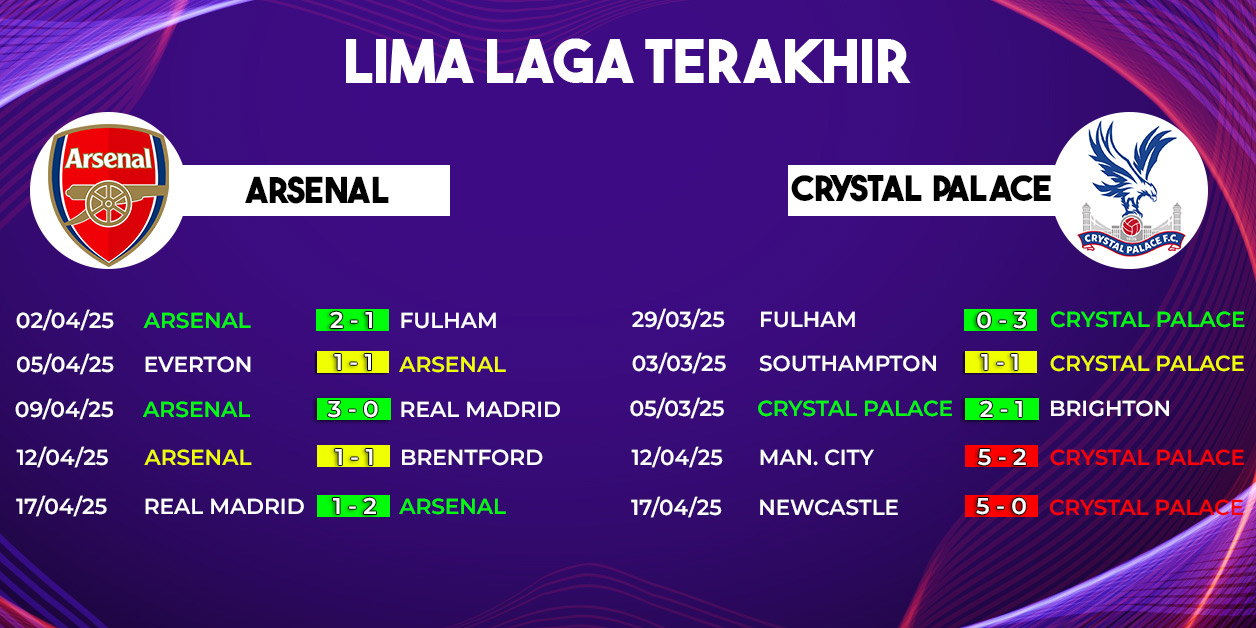Dalam lima pertemuan terakhir kedua tim di Premier League, Arsenal unggul dengan tiga kemenangan, satu imbang, dan satu kekalahan. Rekor ini memperlihatkan dominasi Meriam London atas Crystal Palace, terutama saat bermain di Emirates Stadium.