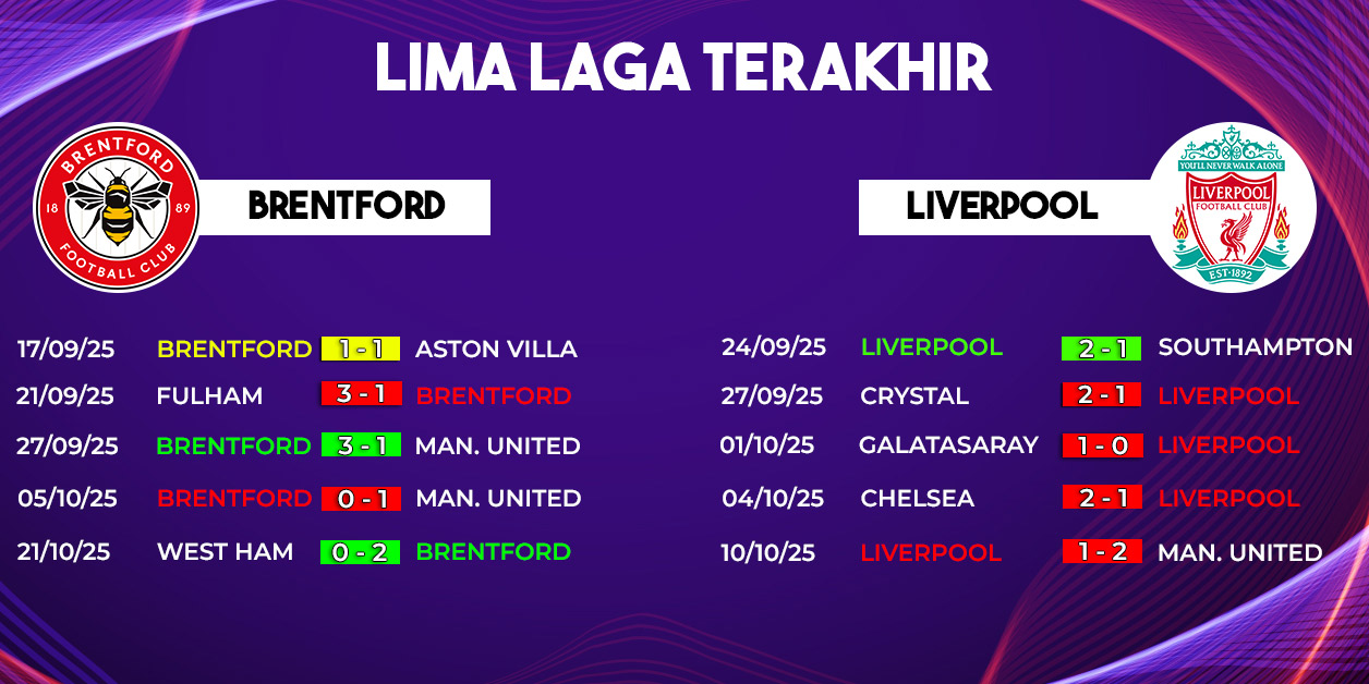 Dalam lima pertemuan terakhir, Liverpool masih unggul tipis dengan dua kemenangan, dua hasil imbang, dan satu kekalahan. Namun, perlu dicatat bahwa Brentford cukup tangguh saat bermain di kandang, bahkan beberapa kali berhasil menahan atau mengalahkan tim besar seperti Chelsea dan Tottenham.