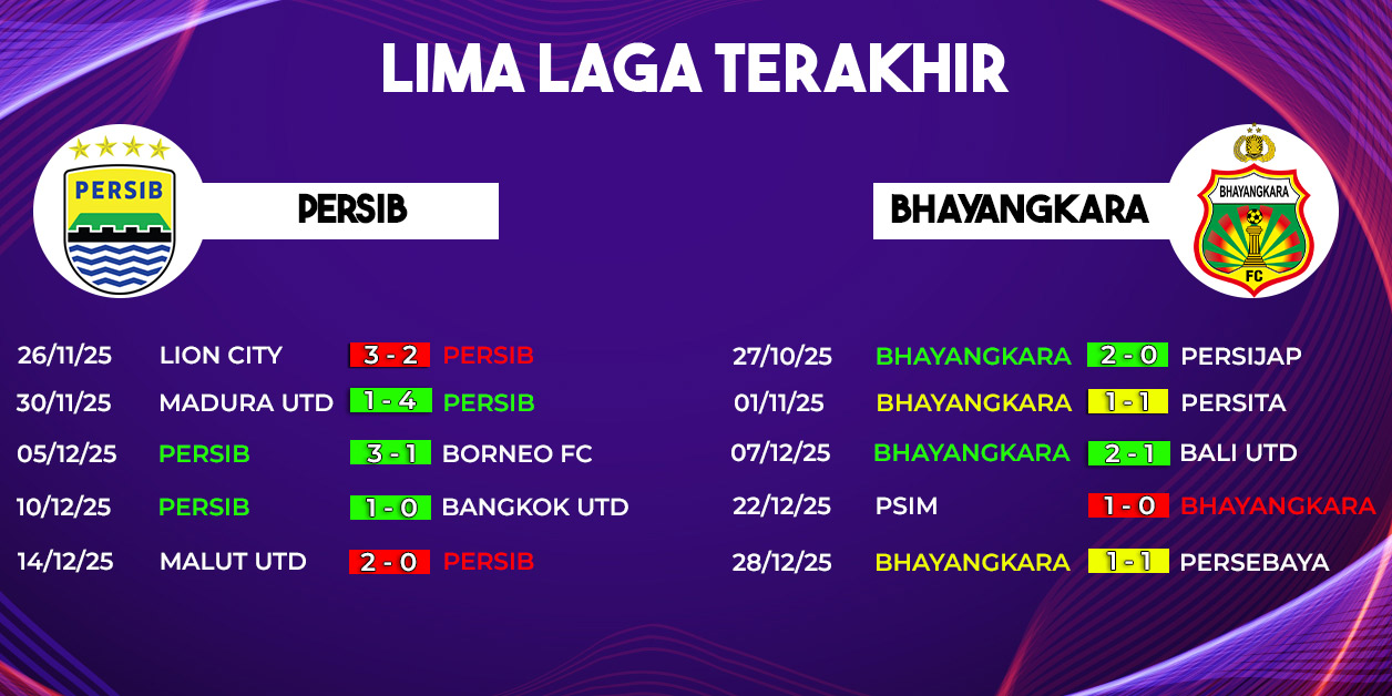 Jika menilik rekor pertemuan, laga Persib Bandung vs Bhayangkara FC hampir selalu berjalan ketat. Dalam lima pertemuan terakhir, tidak satu pun pertandingan berakhir dengan selisih dua gol atau lebih. Ini menegaskan bahwa duel kedua tim kerap ditentukan oleh detail kecil.
