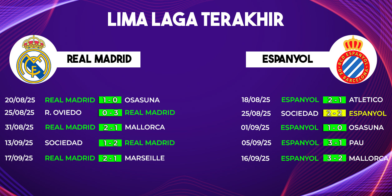 Dalam beberapa musim terakhir, catatan pertemuan menunjukkan dominasi Real Madrid. Bermain di Santiago Bernabeu selalu menjadi keuntungan besar bagi Los Blancos, sementara Espanyol sering kesulitan mencuri poin. Namun, performa impresif Espanyol musim ini membuat duel kali ini diprediksi lebih ketat.